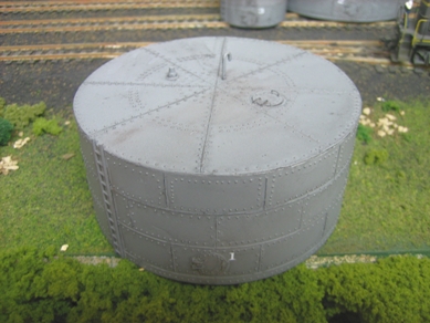 Stopped in at the LHS today and picked up some .015 styrene to make a wrapper for the diesel and lube oil tanks.I started with the lube oil because it's the smaller of the 2, to get the feel for it first. That's the side wall wrapper ,when it drys I'll do the roof. The rivet pattered is from some tanks I saw at Stahl soap in Hoboken NJ.They are fabricated from 4 foot x 8 foot steel plates.