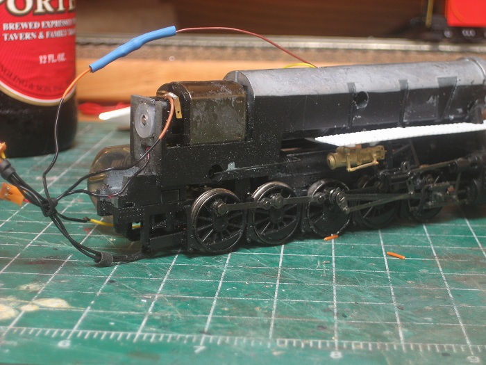 In this pic all you see is the two headlight leads sticking out of the boiler weight, I'll show you how I got there.