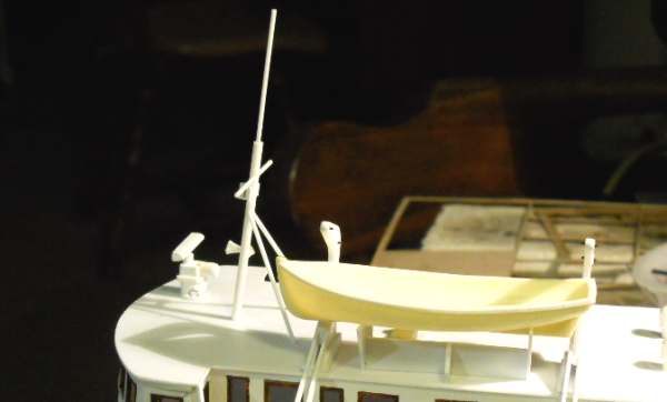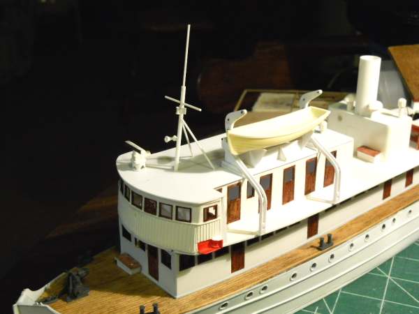 Port bow shot. Even here, the lifeboat isn't "overbearing". Keeping it, will make necessary the adding of a ladder to above the cabins, and railings ( at least some ) on that level, for crew safety when lowering or raising the lifeboat.
