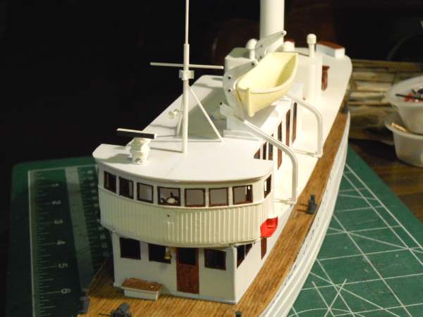 The decking, on the Bridge deck, turned out quite nicely, and I'm thinking that if I do use the lifeboat, and davits for it, I may lay in decking from just aft of the "mast", to the aft end of the Bridge deck cabin's overhead, and enclose that area with railings. I can use an external vertical ladder, center-line aft, for access to that level.