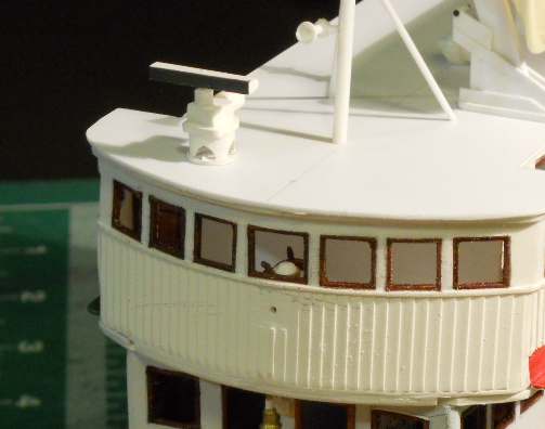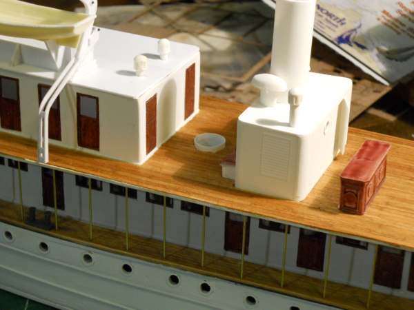 Here, the skylight sill can be seen, fairly close to the proper height above the deck. This shot also shows the vertical posts between the shelter deck, and the bridge deck.
