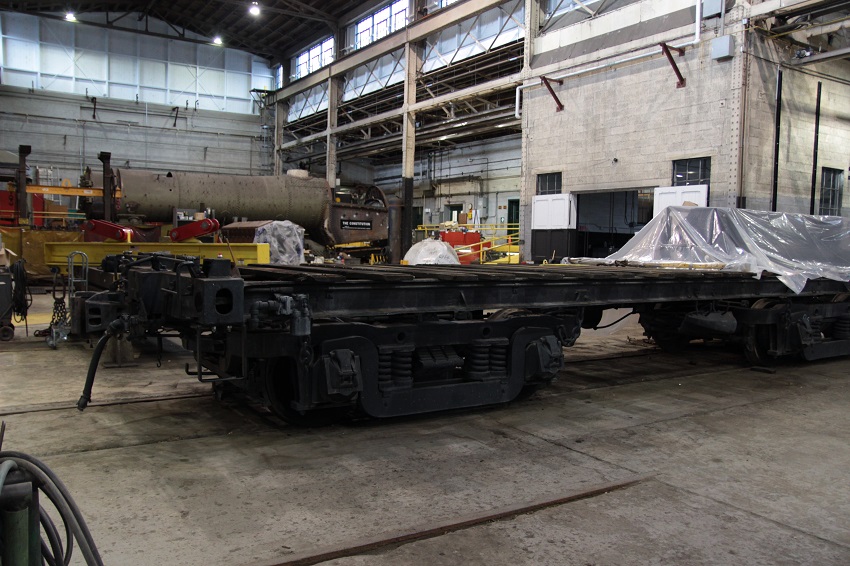 As of now the tender frame is still parked in the same location as before. In the pic you can see the wooden planks placed on the steal frame to help support the cistern. Also the front of the frame, where the stoker is mounted, has been encapsulated as some asbestoses was discovered after the tank was removed. After that has been cleaned and the "Historic Structure", as Steamtown calls them, is deemed safe I will get some detail shots.