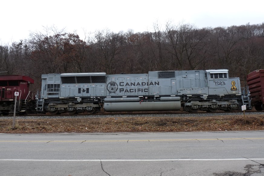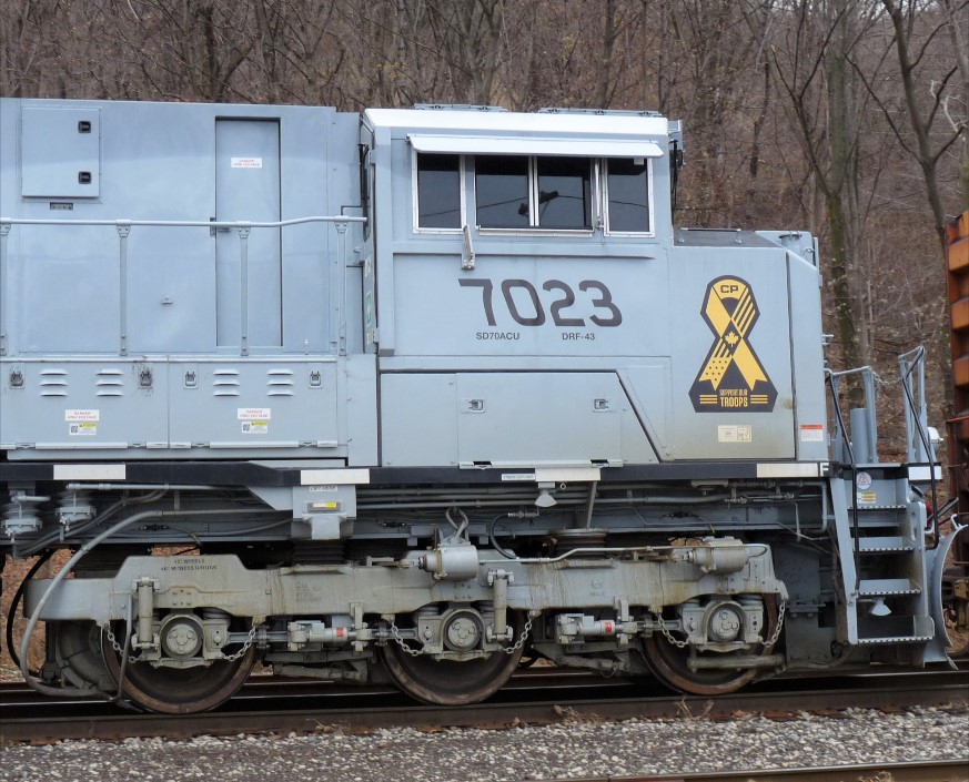 I received an e-mail this morning from a local railfan who informed me one of CP's "Veteran" units was scheduled to run through my hometown on CP train 246.I rushed down to Lawrence Rd. hoping I wouldn't miss this train.One of the issues with local train watching is that there are no precise times to catch CP 246---it could be early morning or late afternoon and today the train arrived at Kinnear Yard around 3PM.It was a long day but the wait was worth it as I caught my first "Veteran" which honours our Air Force #7023.I've always said you have to be a little crazy to be a train watcher.