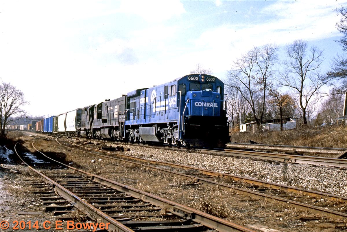 March 19, 1978. C30-7 6602 leads CG8 through East Palestine heading for Conway.     Charlie