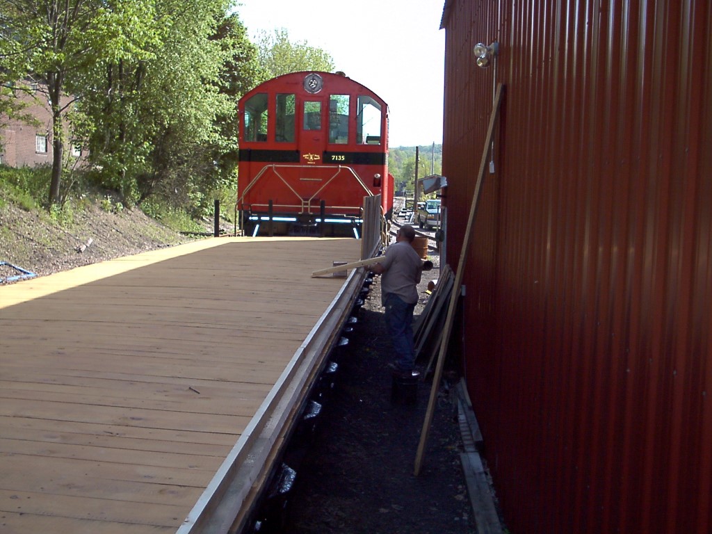Rebuilding the tourist open air car 5/9/2001. Kiski Junction. Folks would freeze to ride out here rather than be inside. One of my volunteers told me that we wouldn't have anyone riding it when we got the coach. He was so wrong. We couldn't get folks inside even if it was storming. Nope      Charlie