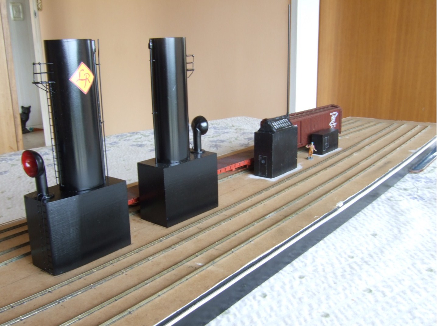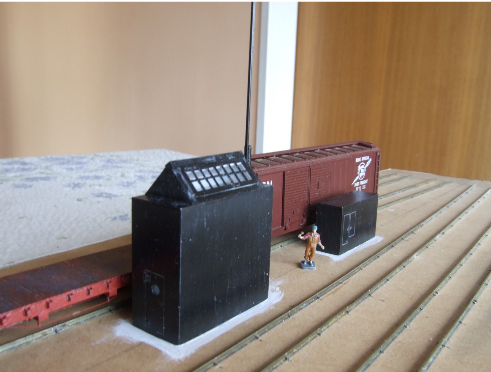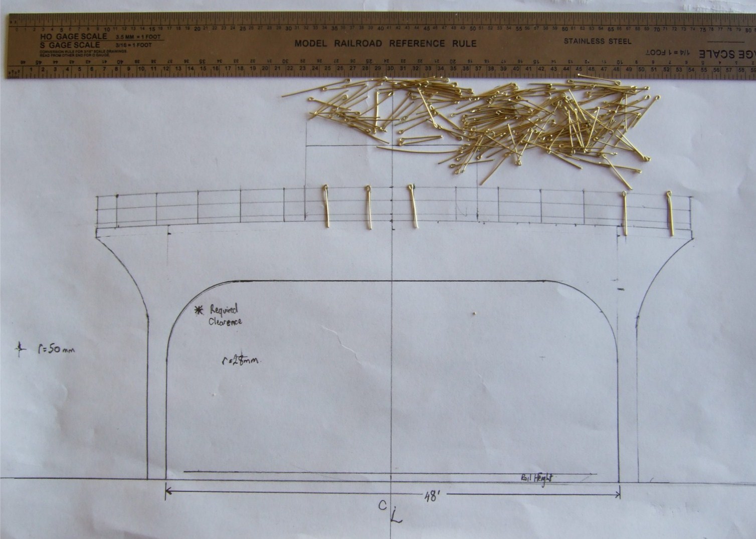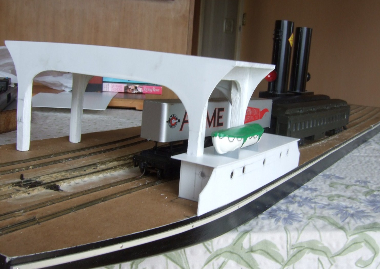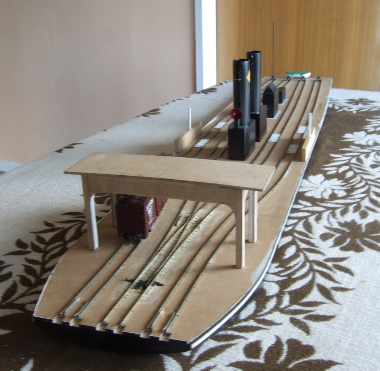 A Confession. If you look at the construction photos of the funnel support superstructure on page 5, you will see that they are square. (I know now that they’re a little wide but I’ve got over that). If you look on page six you will have observed that the forward one now has a taper. That is because after I had laid the track I checked out the superstructure clearance using an Athearn BB 40’ box car, it was tight but ok. Talk about brain fade, especially when I had photos clearly showing 50” cars.