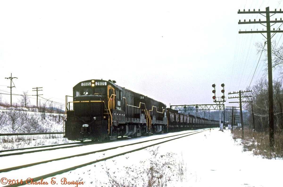 A pair of U28b locomotives heading north with a string of empty ore Jenny's at West Pittsburgh, Pa. February 11, 1979.