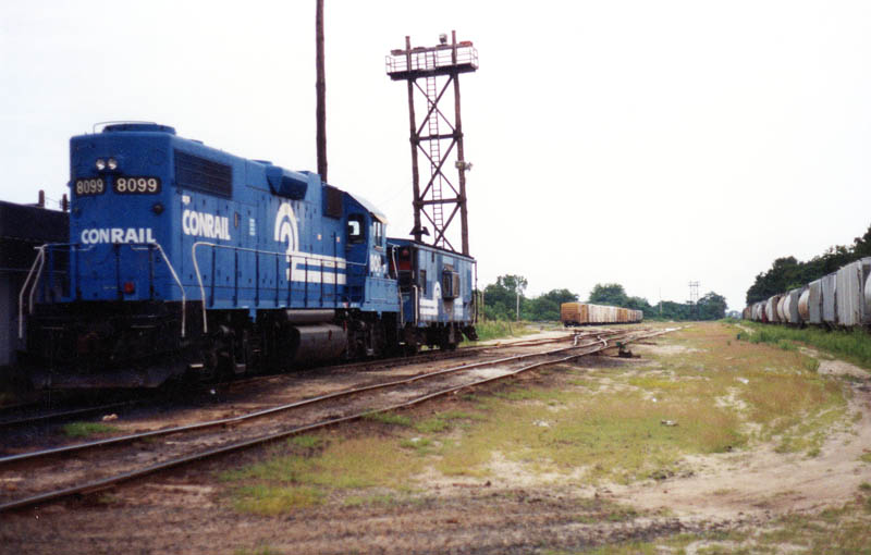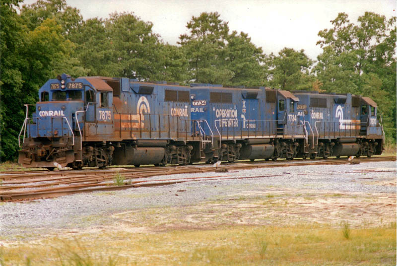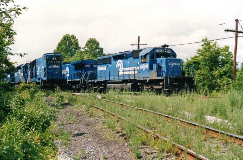 Engines from WPCA-51 wait on the interchange siding at Winslow, NJ, in July of 1995 as WPCA-20, a coal train to Beesley's Point Atlantic Electric power plant passes.