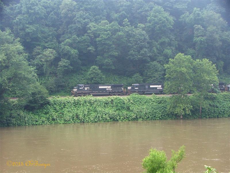 Early morning on the Conemaugh line eastbound at Bagdad, Pa. The river is the Kiskiminetas and the location is about 2.4 miles from the Allegheny River. We were on our way to deliver gondolas to the mill.