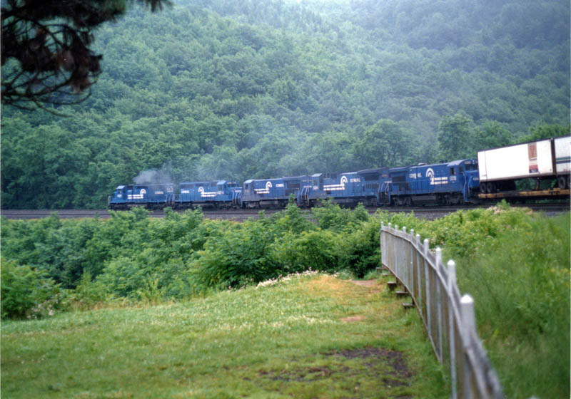 Conrail intermodal on the upgrade at Horseshoe Curve, PA, August 1990.