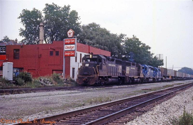 Westbound with the U. S. Mail August 3,1977 at East Palestine, Ohio. The Dodge dealership was owned by Dutch Neil, and was the only Dodge dealership in the country that did not sell Dodge trucks.