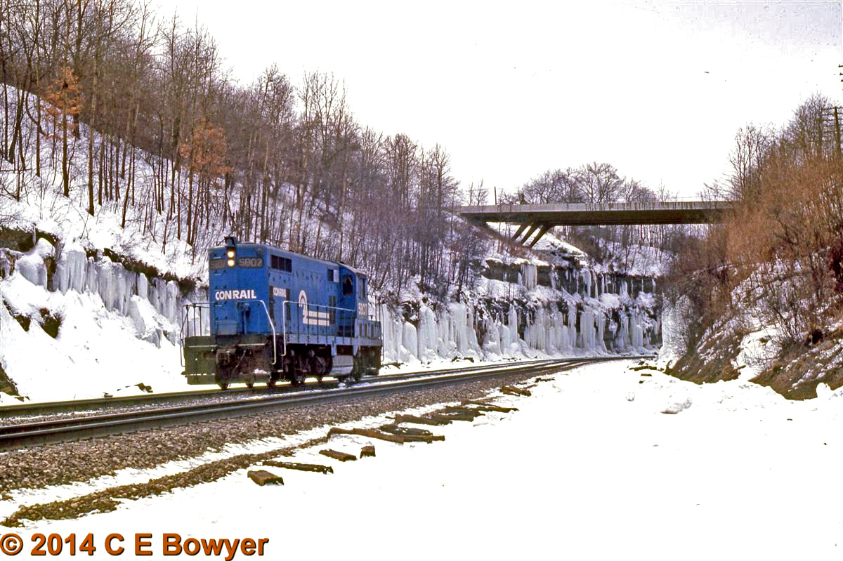 We had some visitors from a foreign road on this date in 1978, Here they are taking a train west toward their home road. The bridge was supposed to be from the old Y&O railroad, a local interurban, and moved to this location. I don't have any way to prove that, but it does look like a leftover from interurban days.