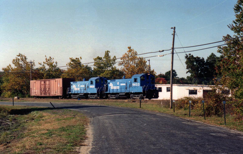 A pair of Conrail SW1001's at Folsom, NJ with a boxcar of bagged sugar for Atlantic Sweeteners October 1991.