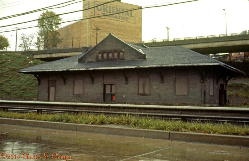 A rainy day in October, 1976. The Rochester, Pa station with the Oriental Theater in the background.     Charlie