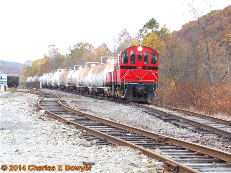 Kiski Junction 7135, ALCo s-1 at Bagdad, Pa with a string of empties coming out of storage.