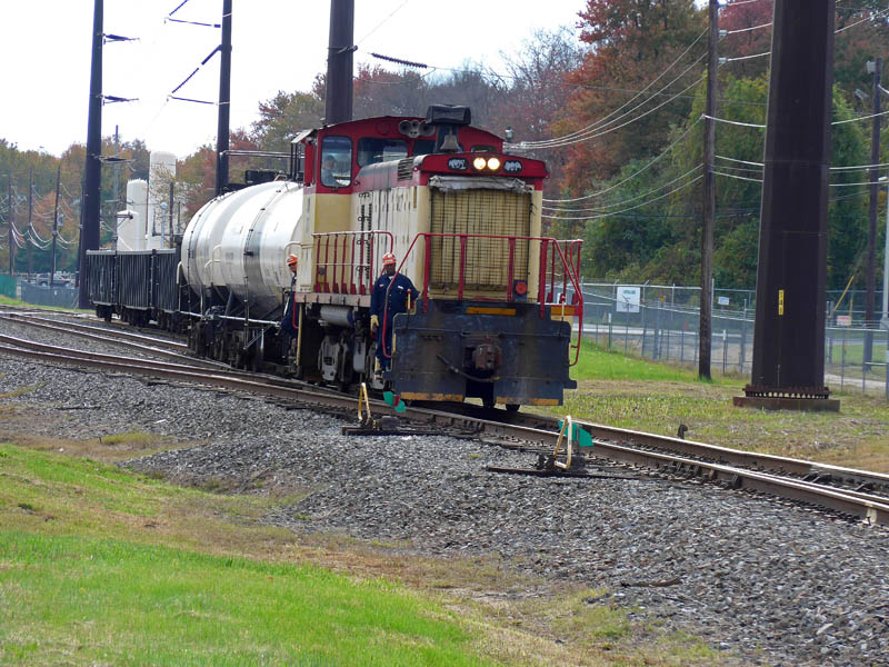 A SW1000 from Du Pont Chambers Works picks up cars dropped off by Conrail at Carneys Point, NJ, on November 4, 2014.