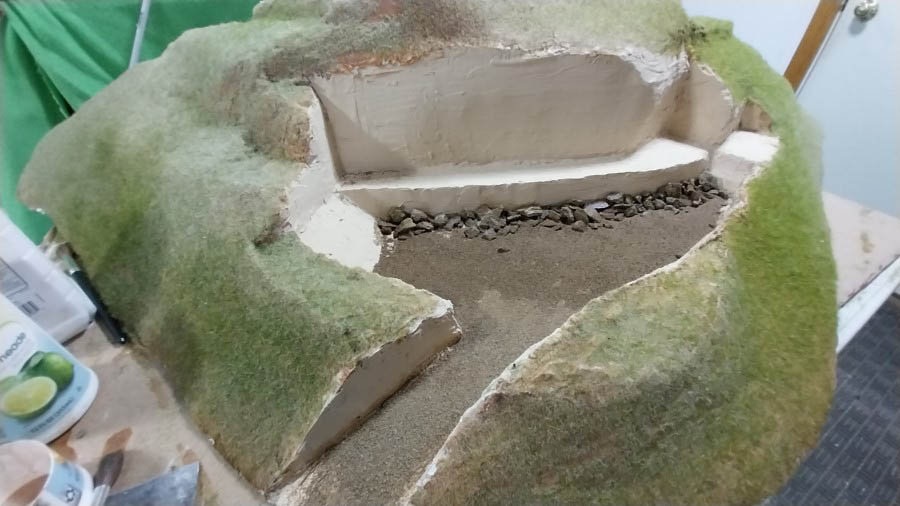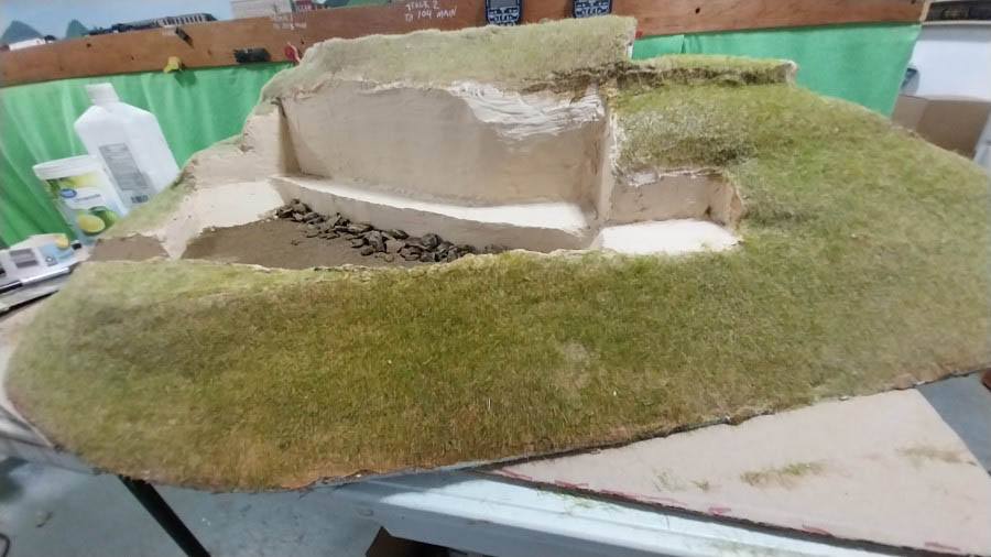 I started on this project in December, 2019, I think it is time to try to finish it. It is a stone quarry where the sandstone is used to make wheels for grinding pulp to make paper. There was one in my hometown of East Liverpool. I did some rock and grass work last night. There is lots to do but I hope by the end of the week to have it in place. I have to build this off the layout because the are it will occupy is the only area that is really a stretch to reach.