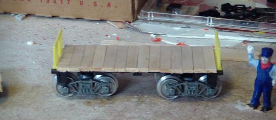 A flat with railings on each end and the start of a wheel car, the trucks are S gauge standard but are only stand ins to I get some more on30 trucks and wheels.