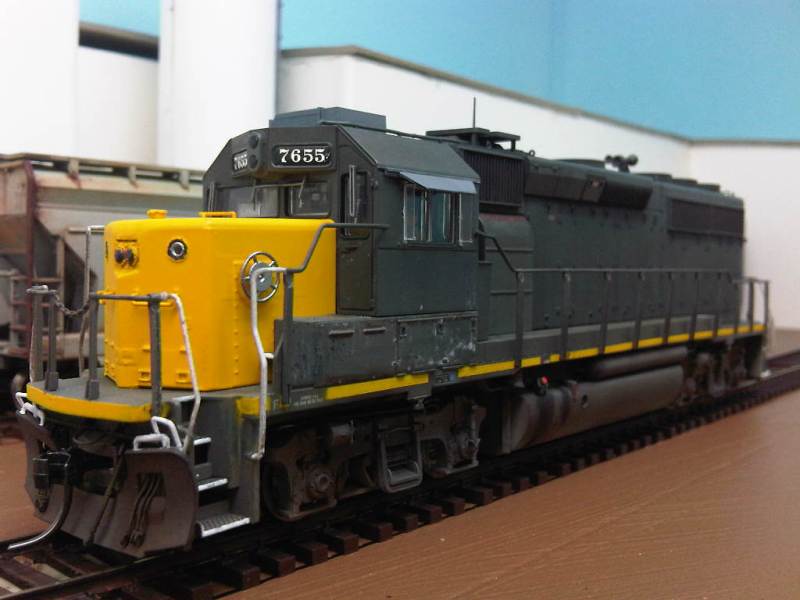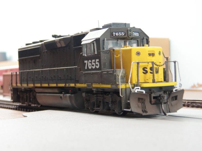 I have had a project on the back burner for a while now and finally got to spray some paint on it. I have 2 Atlas Masterline GP40-2 Ph II's one SSW 7645 and the other SSW 7655 both of which I have shown in weathered form in other threads. I have seen the "current", UP repainted version of SSW 7655 on the net and have wanted to change this old SSW to the more modern version... This is the origional Atlas that I weathered: