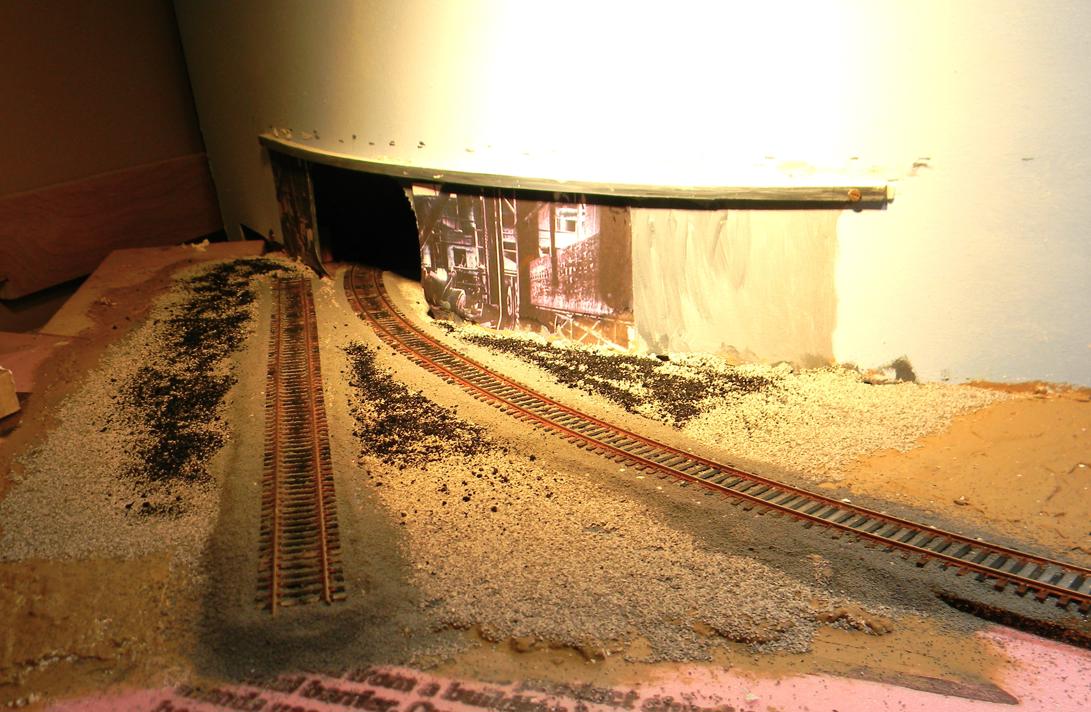 The ground level is starting to take on some reality.  After painting rails and ties, the track was ballasted this afternoon (still drying).  I also had a small packet of coal dust (my supplier hasn't come through yet with refuse from his bags of anthracite) which I spread in amongst the gravel.  Next will be permanently placing my piers and adhering the first floor to the backdrop.  I'll be removing some of the gravel I put down to get a nice flat surface for each pier.