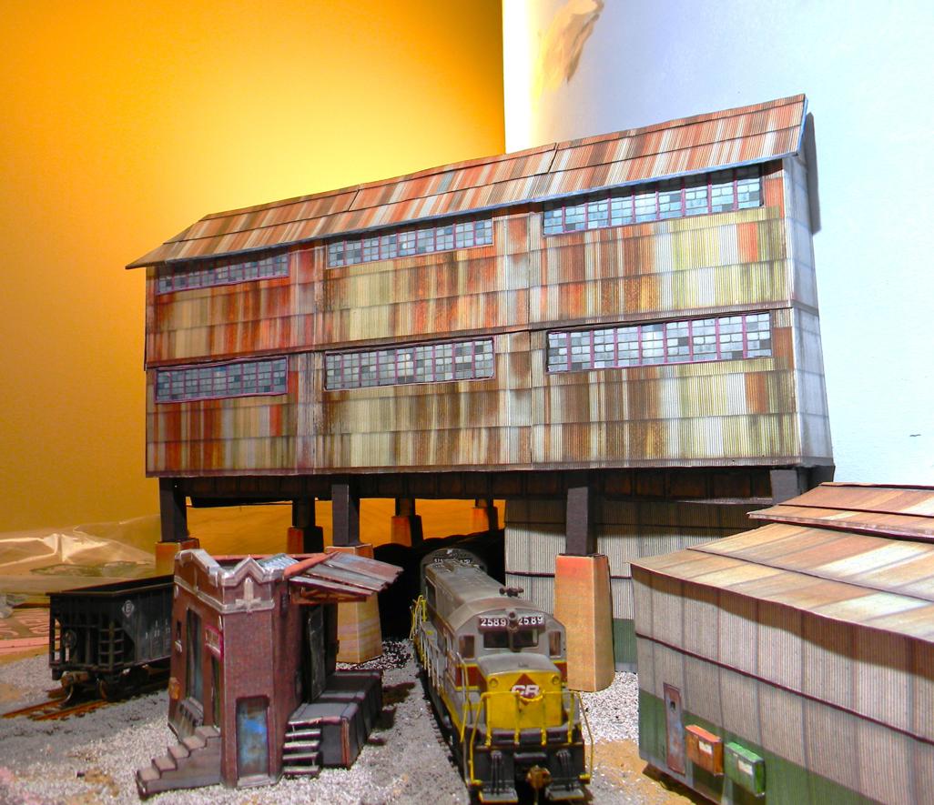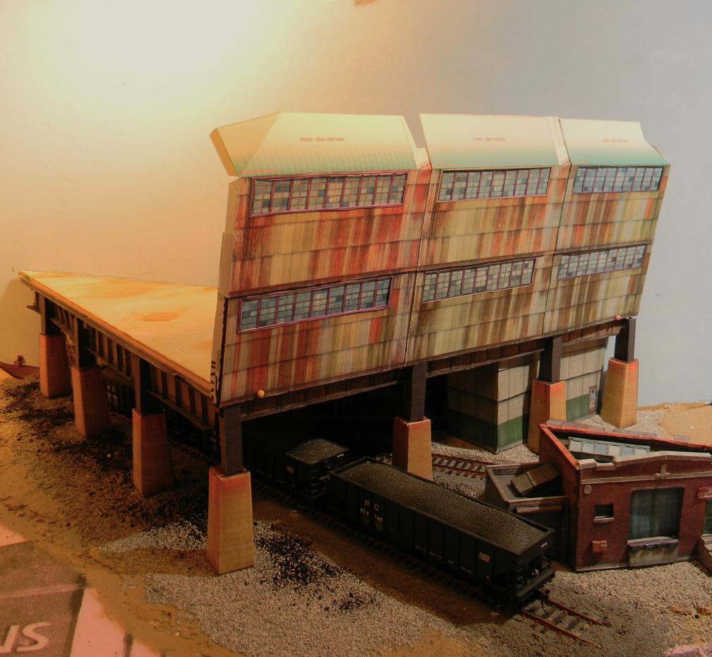 Last night was the night.  Slapped a bead of silicone sealant on the edge of the first floor where it rests against the backdrop and let it set up in place overnight.  Added the piers this afternoon and I also placed three hoppers on the track to nowhere.  Roughly positioned "Plant #2" (sits in the picture behind the last hopper), and as you can see in the picture below, I think the entry to my storage level is now effectively hidden - that part of the mission I can now say is complete.  I have a few things to add to the understory, but for the most part, the upper stories of the coal breaker are now my focus, which means a lot of printing and bashing of paper.  I think the understory looks beefy enough to support a massive structure above it.