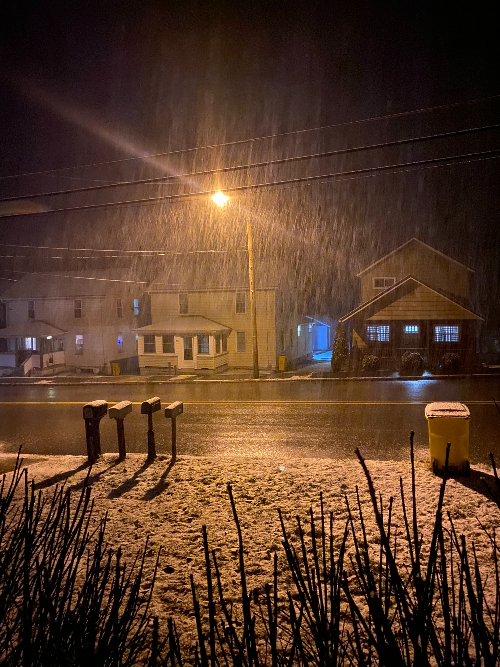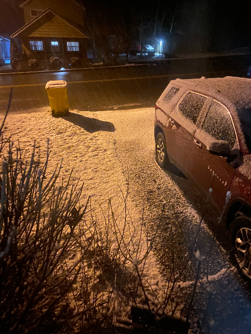 It'a 15 minutes to 10PM and we are getting snow. It has been snowing for 3 hours. Its that fine stuff that will not pile up fast but if in snow long enough we will get some. We are supposed to get up to 2 inches and I will say we have an inch already.