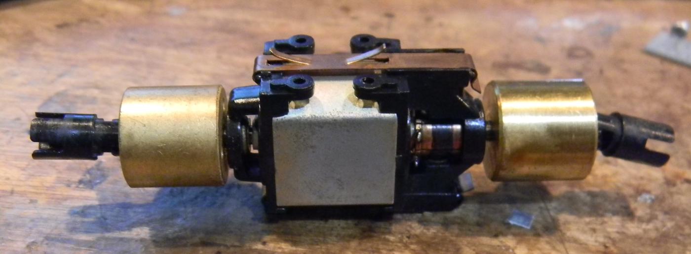 1) This might become one of the simplest DCC conversions ever (aside from those "plug and play" types). The motor has big ole' solder tabs, the track pickups are right on top of the gear towers and the incandescent lights have already been routed with plenty of extra wire length. The gear towers are isolated from the chassis via a set of washers that the gear towers pivot on - I'll check for any continuity with a multimeter in the coming days, but I'm pretty sure I'm going to get an open circuit between the chassis and track. I'll also look for an open circuit between the chassis and either of the motor connections.