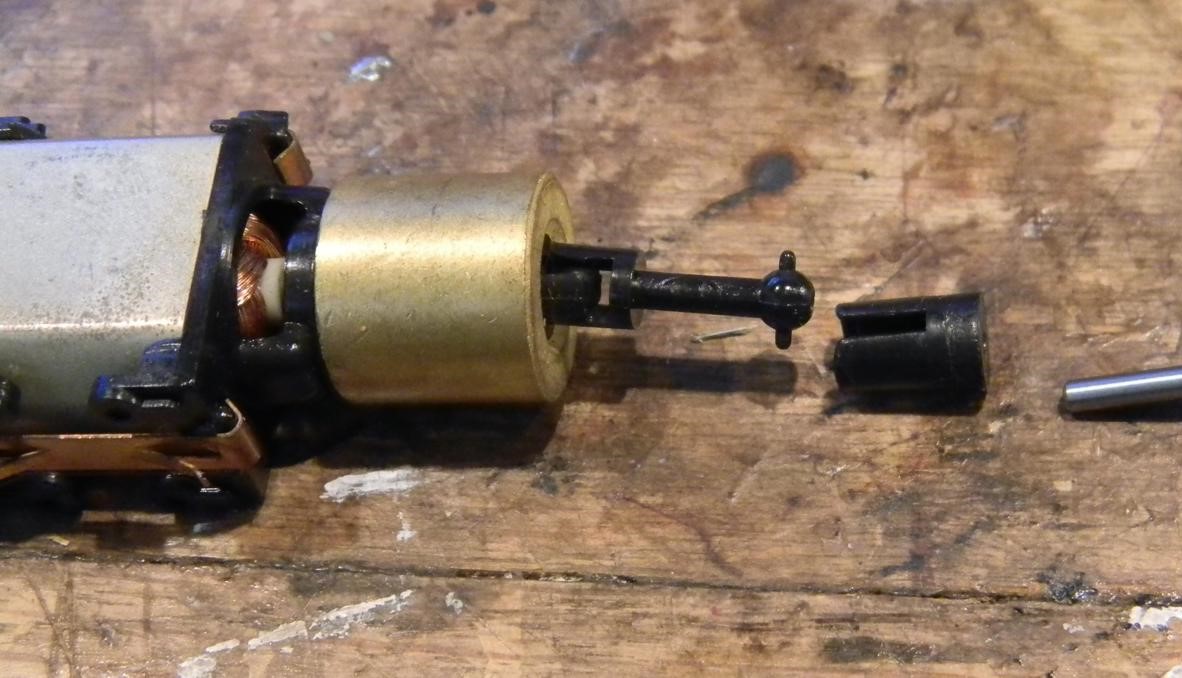 Measured up the steel gearshafts - 0.093" according to a set of calipers and found a bit of the same size. Ended up putting it in the chuck of a drill press, but rather than turn on the motor, I just twisted the plastic knuckles up onto the bit through the smaller hole to take away the extra material. Nice friction fit when all was said and done. When I came home from work today I got the cutting wheel back out and took the extra length off of the forward shaft and inserted both knuckles on the front and rear shafts and slid in the motor with the shafts connected. Looks like a nice fit to me in terms of longitudinal slop and ability to move the locomotive through a curve and maintain power to the gearing, but I still see some impingement between the flywheels and the chassis that I'll have to address before adding the DCC decoder. As NASA would say, everything's looking good for eventual launch.