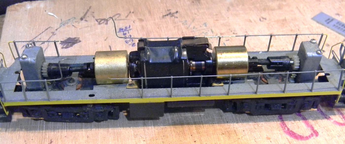 Despite my attempts to dampen the noise of this Japanese motor, it's still quite loud. The Athearn motor was a decent deal on evil-bay and I bought it soon after winning the auction for the EL RS2, after reading about the KTM units' reputation for annoyingly noisy operation. So, I've been looking at real estate and the potential for re-use of the original gear towers. Here's a shot of the can motor laid into the center of the KTM chassis.