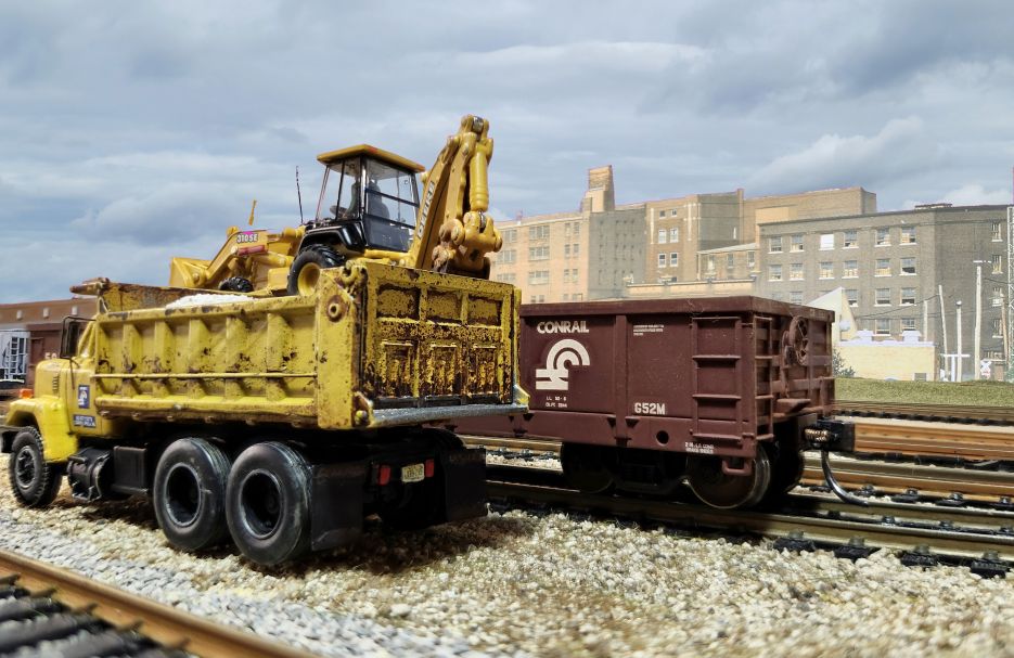 Conrail dump truck being loaded with ballast.
