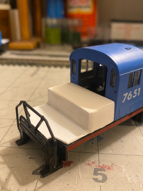 While I was waiting for the joint compound to dry, I went and glued the new headlight on the long hood end and left that dry. I also pulled out one of the two shop switchers Conrail X481. X481 had some work done to it which was to close both ends up and get them ready for paint along with the frame. You can see X481 in the background in the picture below. Matt