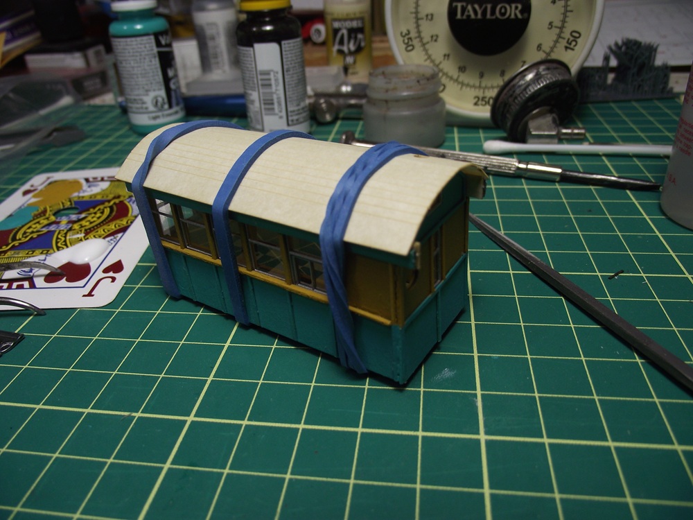 I did have a few gaps arount the corners but I filled then with some extra glue and painted over it. I added the front and rear trim pieces and then it was ready for the roof.