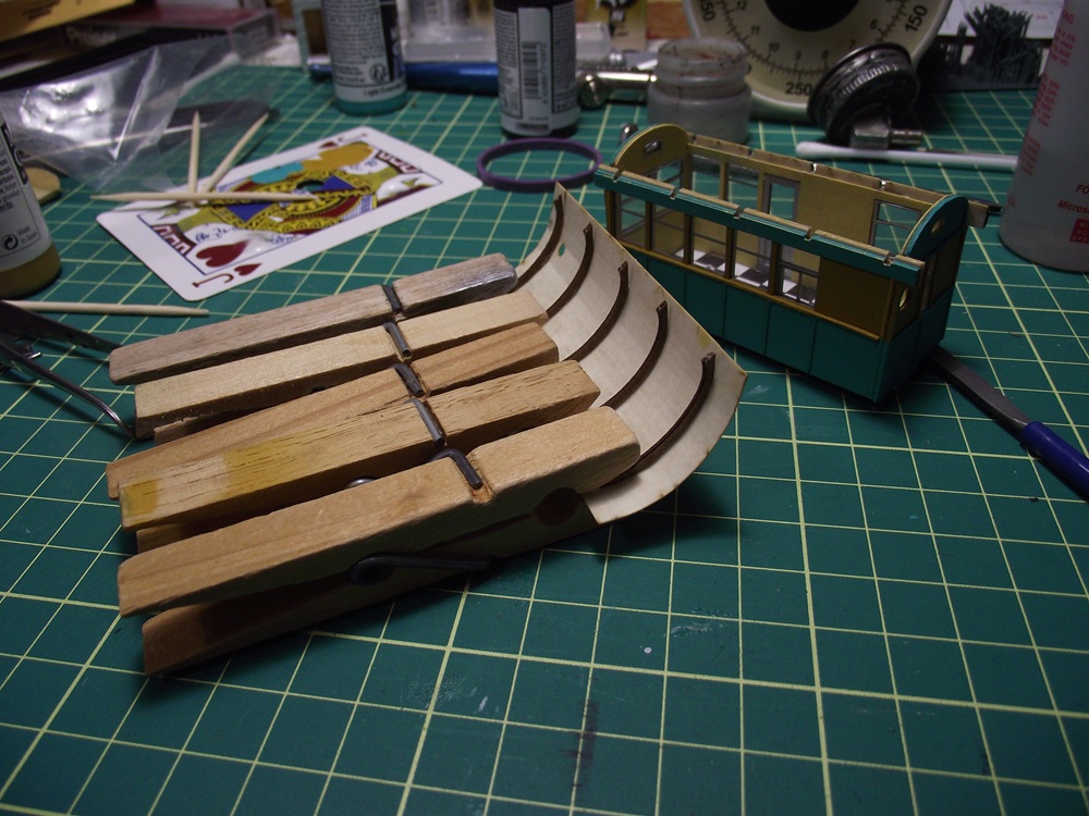 I then added a bit of glue to the ends of the rafters and glued the roof panel down, using some cloths pins to hold it down.
