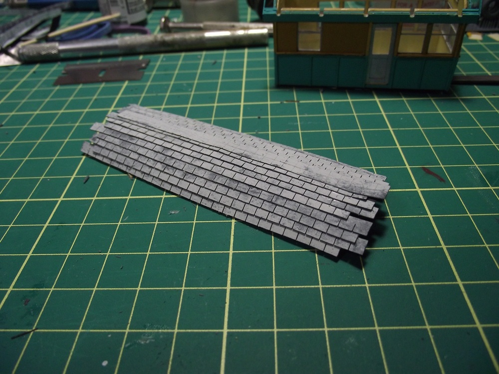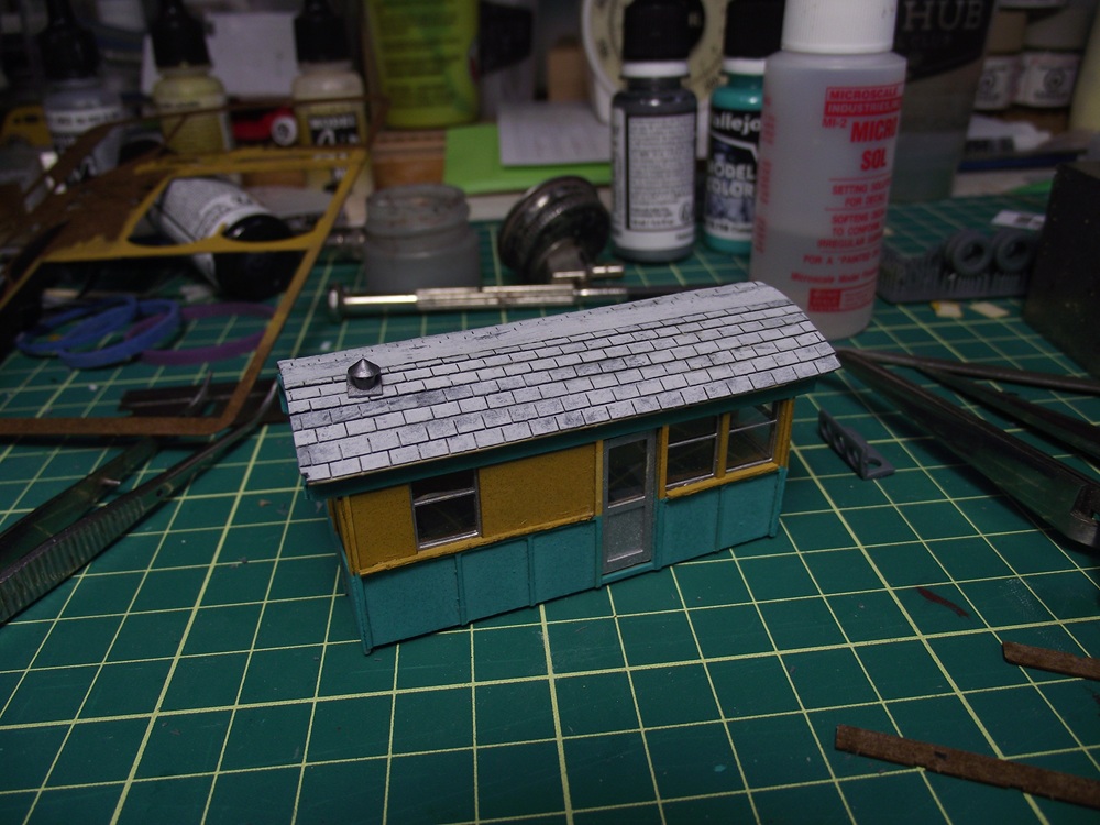 I shingled the roof just like any other kit. Usually I use Scotch douber sided tape to glue the shingles down, this time I used some white glue. It's a small roof to it only took about 30 minutes to do all the shingles.
