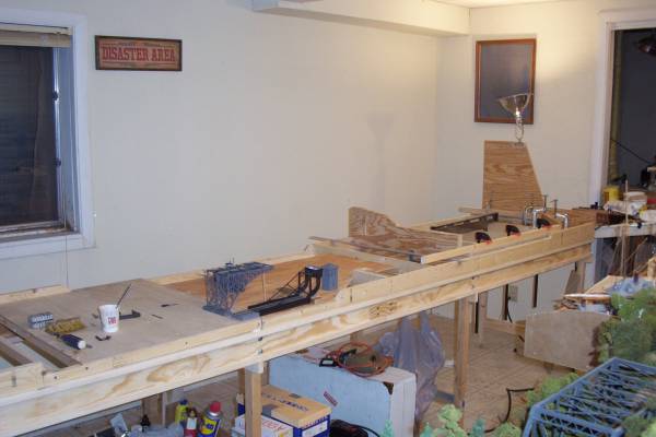 Kevin one trick you might use is to build your bench work as a "kit" where all of the pieces are designed and cut outside of the basement, then you just carry the pieces down and bolt them together in the basement. The problem with having a restriction in your stairwell that limits the size of a part of the bench work that can be carried downstairs while the actual bench work in the basement is not so restricted is that some complicated track that you might not want to straddle a joint may have to straddle the joint if you need to carry the completed bench down the stairs. If you want to use dimensional lumber, the modular club that I belong to has found that poplar is a relatively inexpensive and light weight hardwood that is more dimensionally stable than the typical pine, fir or what Home Depot calls "whitewood" whatever that is.
