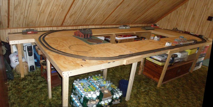 ** I have not been to bussy here for awile. Their is a reason for this. That attic switching layout I have, that replaced my large basement layout, well I can't handle going back and forth, even if it has a purpose to deliver, and pick up railroad cars. I got to go round, and round! This necessitated a rebuild. My switcher layout was 2, 2'X8', of 3/8" plywood surfaceses. Put together longways to make a 2' X 16' switching layout. It was stiffened up and held together with 2" X6" X 8' boards. Their was not table legs or even table bases because of the 4 shelf units I have along that wall of the attic were used to support the layout. Well that is gone now!