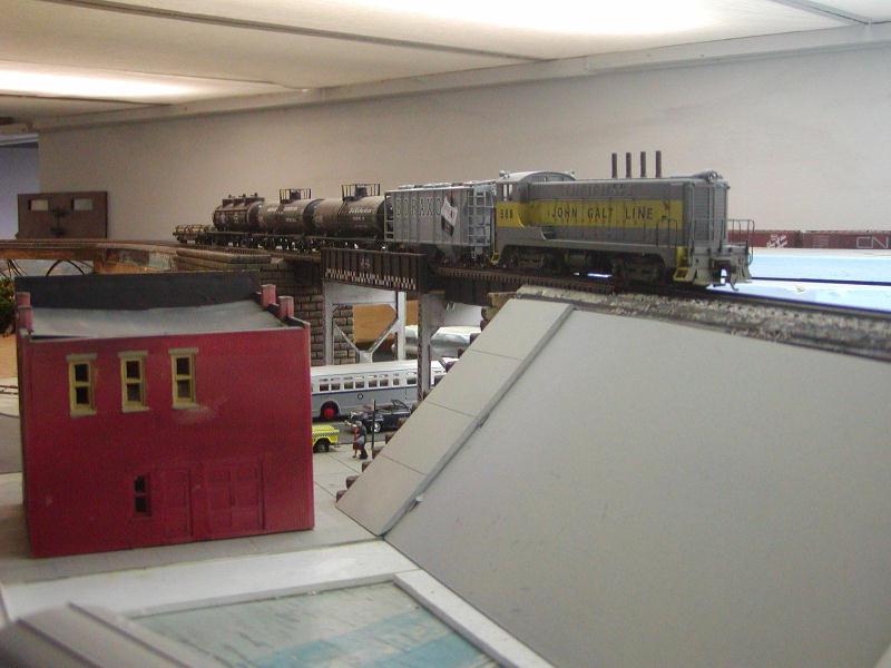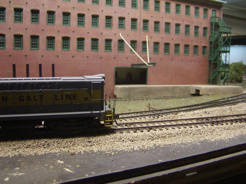 This time a poorly lit photo shows the train departing the main and entering the Garfield branch. I shot these photos using just room lighting. That's the finished except for the loading dock area Quinn Ball Bearing plant in the background. Actually, I am working round to that area and so it will (should) actually get done sometime this year.