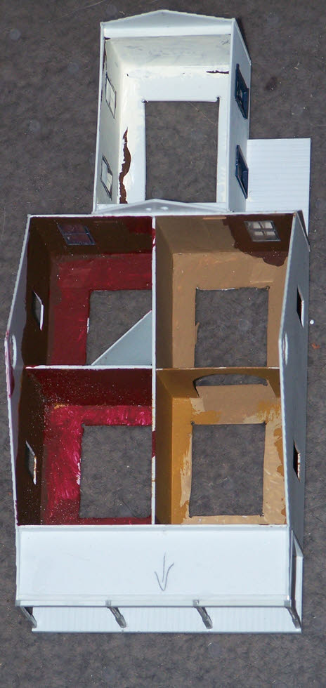been a while since an up date , room's have been painted with several thick coats of dark paint (don't want the three mile island look), the kitchen was over painted light as most kitchens are light colored , front porch ceiling is in place , basic roof is assembled , the faux dormer was a hold up Wallbang next is the curtains then the ceiling in the house and roof guled down and bardgeboards and peakboard to be added. looks like my project is way behind most of the rest , from photos all are looking great. :mrgreen: