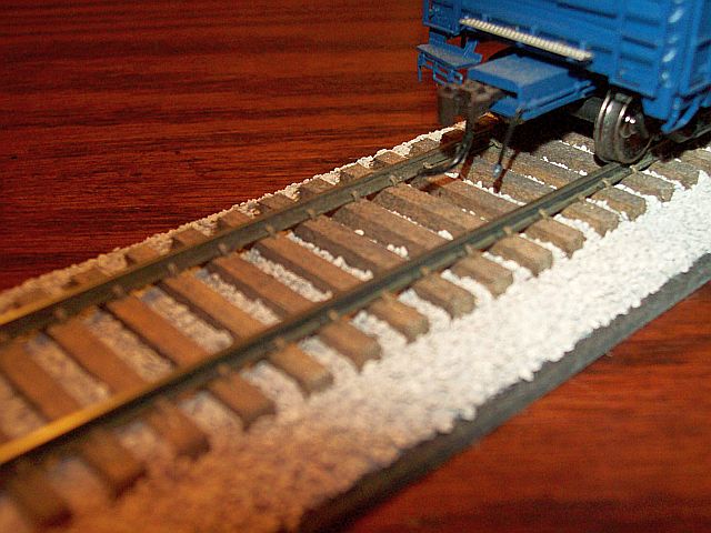 Check out this pre-made Handlaid track.I purchased a single 36" straight piece from <!-- m --><a class="postlink" href="http://www.custmtrax.com/">http://www.custmtrax.com/</a><!-- m --> This track has road bed,Micro engineering rail(code 83 and weathered),Higball light gray ballast,and stained wooden ties and it's flexible.I plan on using these products for my switching layout in the future,along with proto 87 details.I included a photo with my sample and my Athearn genesis boxcar(rp25 scale wheels)I considered going with Xtraks,but my eyesight being what it is,I decided to go with pre-built track.Custom trax has some good prices on "packages"(10 straight,2 #6 Switch's)$139.00.I know it's a little pricey,but i can't imagine "me" having to spike every individual tie(twice).Or having to spend the money for left & right #6 & #8 switch templates.Each switch is about $25.00 w/stand or w/o stand.How much would you pay for 1 Peco switch?