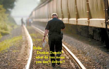 Well, here's a shot of me taken some years ago at a rather unfortunate trespasser incident on Conrail near Greensburg, PA. In the distance you can see several people standing at the site and I am on my way to releive the other officer. Naturally, I'm not even there yet and am getting calls from 'the boss' wanting to know everything! A local news media photog caught me from behind walking down the track while making a very important call.