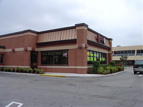 Well, let's start things off with a picture of the prototype. I'm pretty much going to based it on this Wendy's, but I've already had to make some changes to fit the building within it's alloted space of 8" x 10". This will likely be alongside the gas station.
