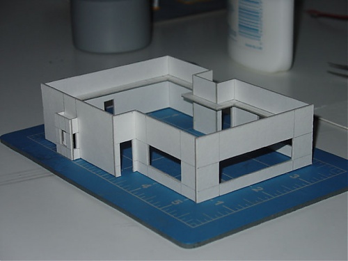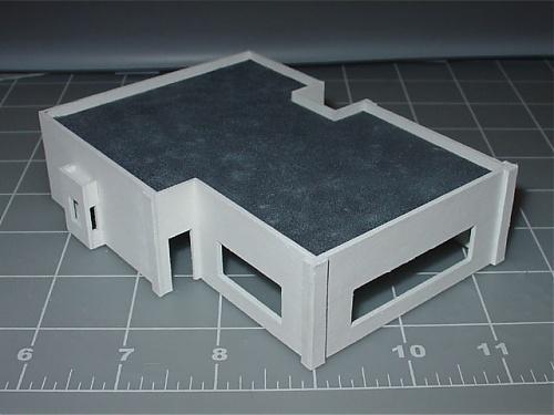 The pieces you see on the larger mat are some of the walls with windows/doors cut out. The odd shaped piece you see on the little mat is going to serve as a ceiling frame to hold the wall pieces together. Note the odd shape of the structure. This is a technique I developed with the Chevron that allows me to build the structure as a removable piece from it's base, at the same time allows me to have a removable roof as well.
