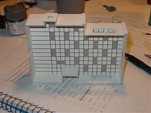 In this photo, you see the simulated ceiling tile. Basically, it's just a piece of poster board with holes cut out, painted an ivory color, then lines drawn over it with a black fine point Sharpie. There is a layer of thin translucent tracing paper glued to the backside. This helps disperse the light evenly, even with as little as a single LED.