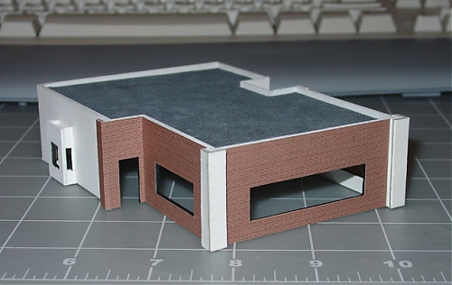 The building's made of illustration board - it's a kind of card stock you can get at Office Depot. The bricks is just a graphic that I printed out on paper and using spray adhesive, attached it to the walls. I took a picture of the wall and straightened it out in Photoshop. Then I repeated it over and over and printed out a sizable sheet of it. Smile