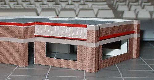 Once I had this completed, I transfered the size and shape of it to the building and cut out the opening. This was very much a pain as I had to be careful when handling the model but apply strength because the cardstock is rather thick! The final step was gluing it to the building.