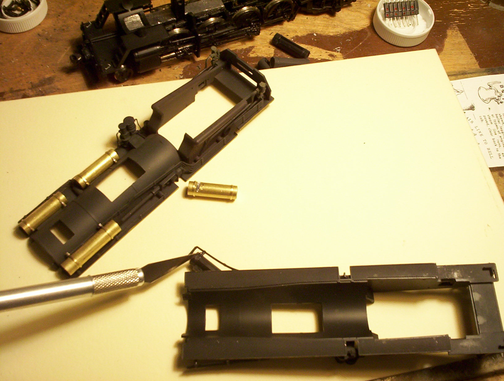 The first step is to remove the plastic air tanks. I used a utility knife for this, as the mounting lugs cast onto the boiler shell are fairly heavy.