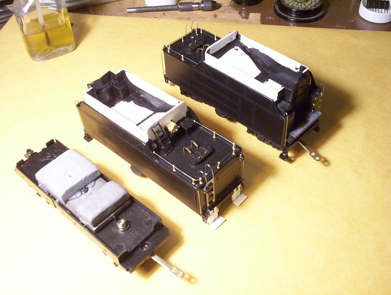 The balance of the loco work involves reassembly and, if you wish, detailing, paint, etc. I also modified the tenders to pick up current, using trucks from the Bachmann Consolidation. To use these trucks, the mounting bolsters on the Athearn tender need to be cut down enough so that proper coupler height is maintained. I set mine up so that the rear truck picks up from the right rail and feeds to the right (Red) terminal on the motor, while the front truck picks up from the left rail and feeds to the left (Black) terminal on the motor. If you've retained the pigtail and circuit board, you'll need to figure out where to connect the wires, which may make separation of the tender from the loco difficult. I used a two conductor mini plug between the loco and tender, which works well for my unlit, DC powered locos.