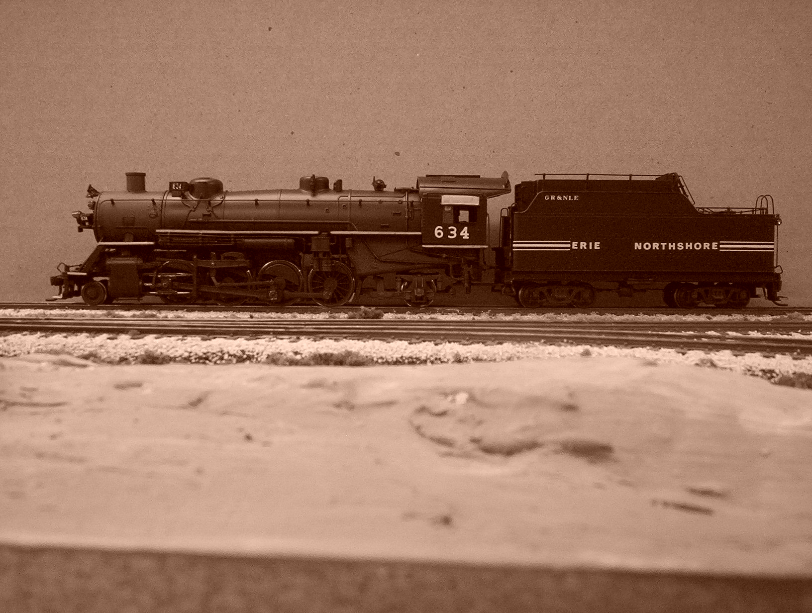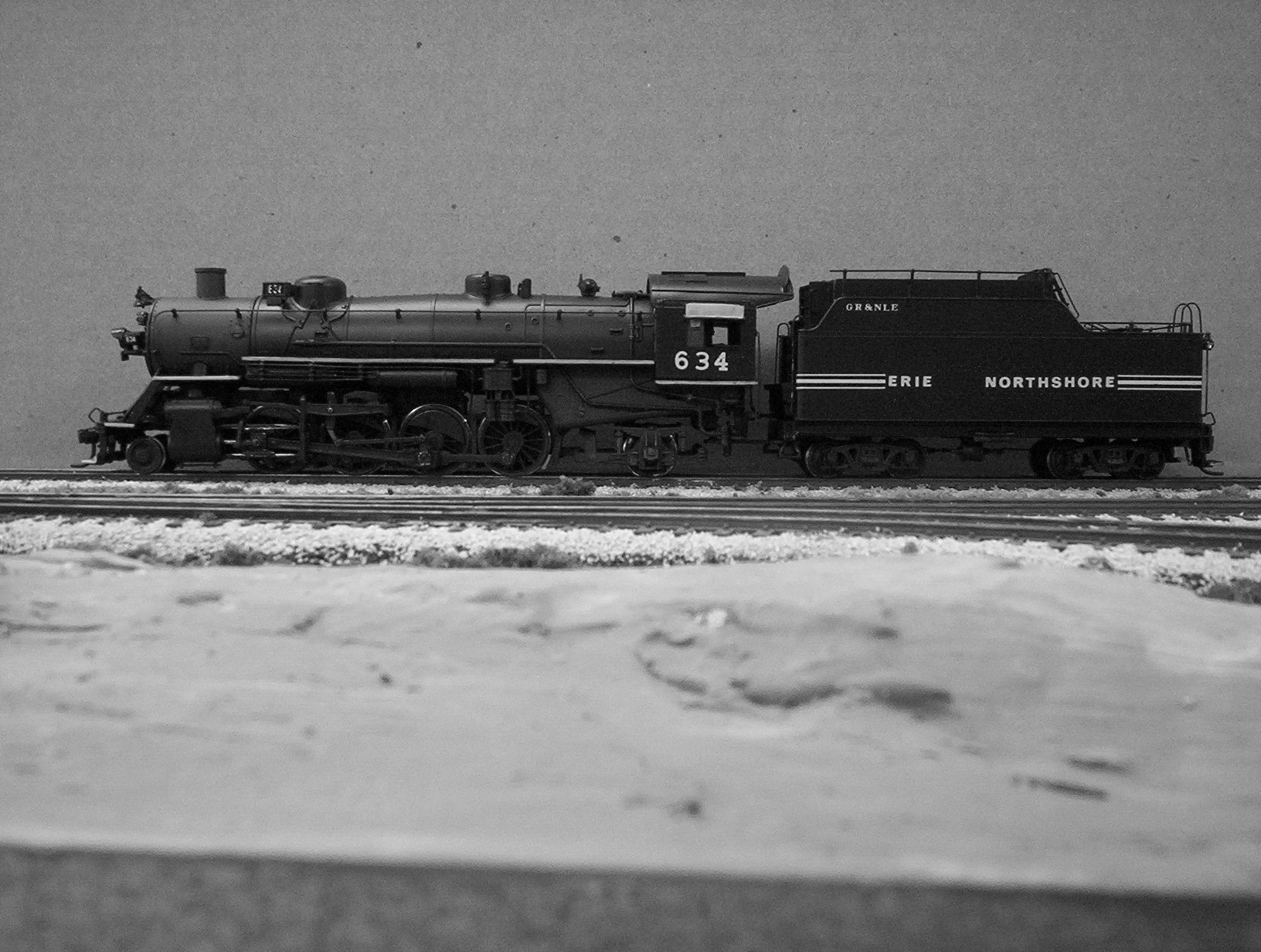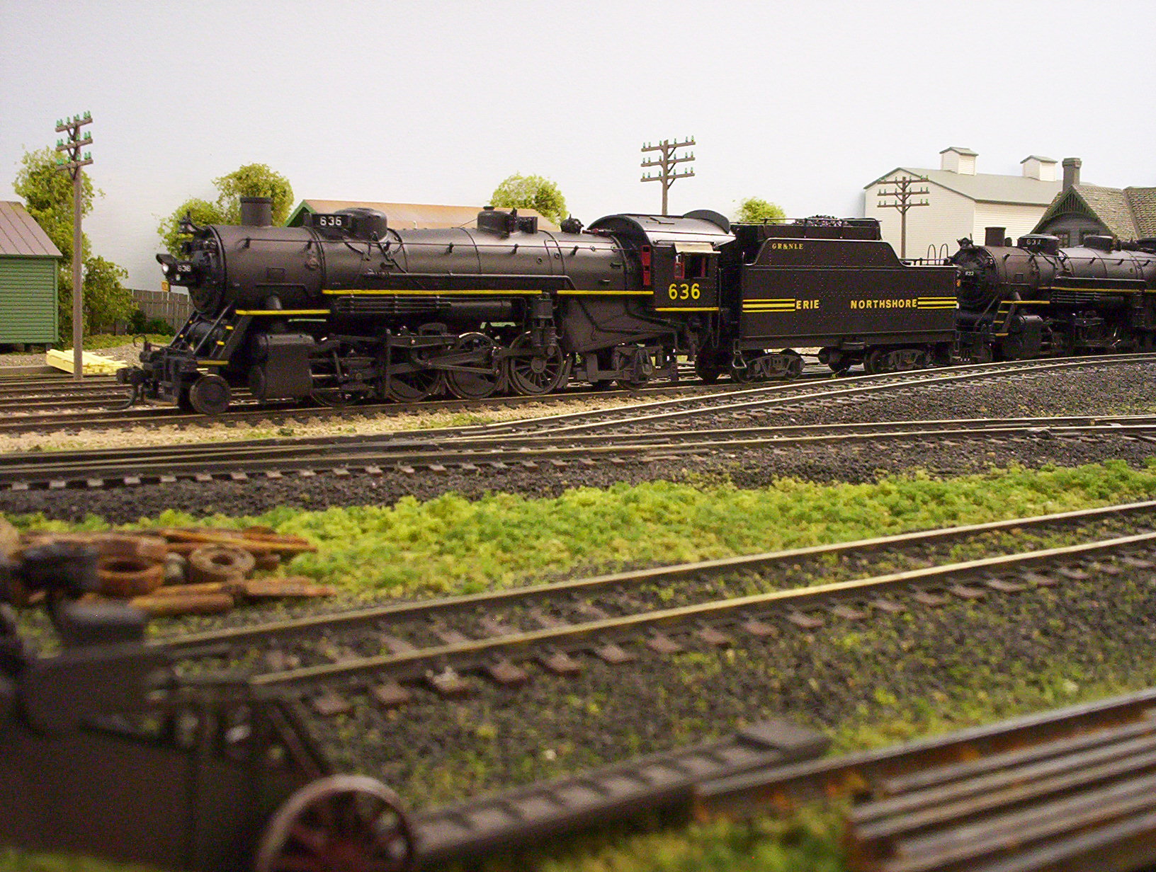 The stock Athearn Mikado, loco only, weighs 12.5 oz., balanced at the rear of the third driver. The modified Mike weighs 16.75 oz. (later increased to 17.5oz), balanced at the mid-point of the driver wheelbase. I have removed the overly strong spring from the trailing truck, as this tends to shift the balance point too far forward. I may experiment with the spring reinstalled, with more weight added inside the cab. As it stands, the added weight, along with the shift forward of the balance point, has greatly increased the pulling power of these locos. I operate them as pairs: two will handle a 13 car coal train (100 oz. weight) up the 2.8% ruling grade on the subdivision or will pull a 24 car merchandise train up the same hill. The grade is laid out on a 34" radius "S" curve, with the distance between the curves shorter even than the length of the 13 car train, so the effect of the grade is compounded by the curves.