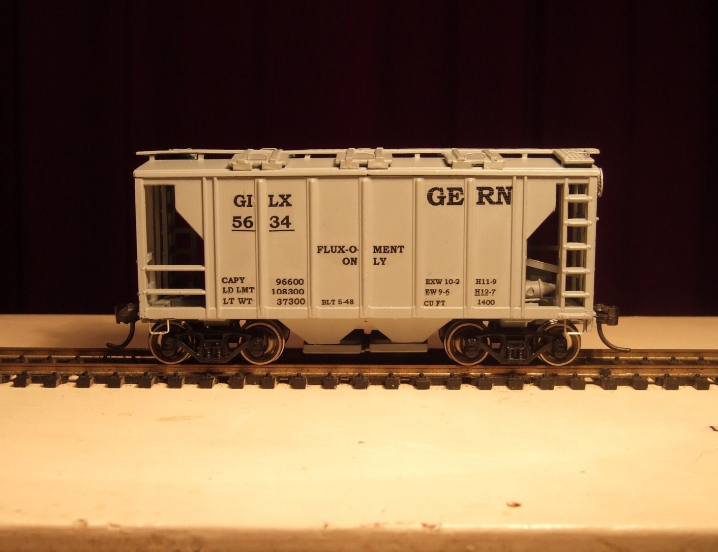 The roof and roof walk is made from .020” styrene sheet that I scribed as I’d seen plans of a wooden roof hopper, the hatches were scratched using the hatch dimensions from a Tichy cement car I’d recently completed and the green bracing was my rough interpretation from the plans of a PRR H30 I’d seen. (This was before Bowser had produced their RTR version).