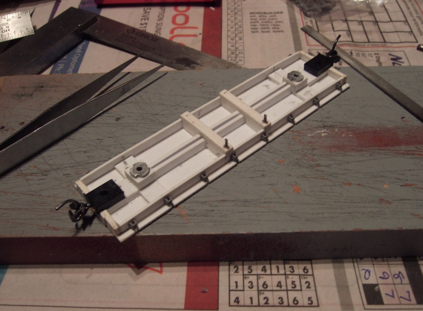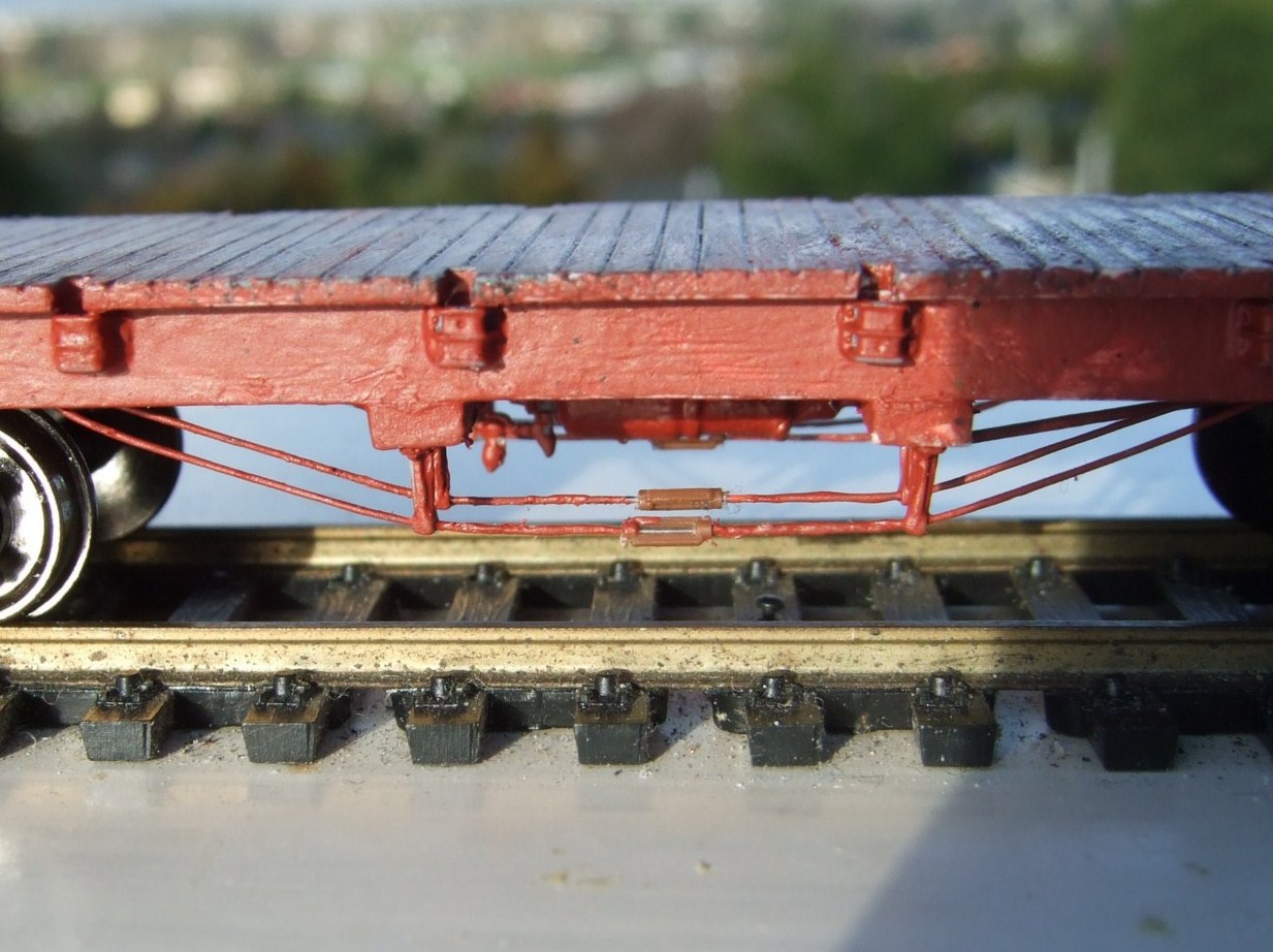 In a thread in another forum I became aware of doctorwaynes use of monofilament and Tichy turnbuckles, and decided to try to emulate the method. Of course being an optimist this was not going to be too difficult, Famous last words!!!  Wallbang I had no end of bother trying to get the monofilament to adhere to the underneath of the styrene deck, and wondering how Wayne had coped, I revisited  the thread only to find that because he was kitbashing a boxcar, it was tied off inside. Eek  I ended up sandwiching the monofilament between the floor and pieces of .010”, using a mixture of CA and MEK, messy, (there was also a fair bit of undesirable language I am sad to say) but it seems to have worked, though I would not include this in any Handy Tips Column.  Nope I do think it was all worth the trouble though.